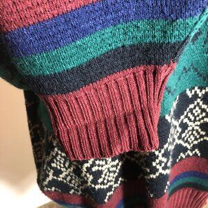 Vintage Stoneriver Outfitters Nordic Geometric Sweater XL – Made in Korea – Eclectic Grandpa Style Wrap yourself in vintage charm with this Stoneriver Outfitters knit sweater — a classic “Eclectic Grandpa” favorite with retro 80s–90s appeal. This sweater features rich jewel tones of burgundy, forest green, navy, and cream, with intricate Nordic and geometric patterns throughout. Crafted from 100% acrylic, it’s soft, durable, and designed to hold its shape season after season. The ribbed cuffs and hem give it a relaxed, timeless silhouette — perfect for layering over a collared shirt for a “quiet luxury” weekend look.
