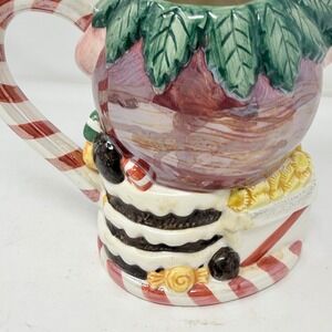 A charming ceramic teapot shaped like a whimsical Christmas fairy perched atop festive treats. This unique piece features a candy cane handle and is adorned with delightful details like cupcakes, wrapped candies, and ballet slippers. Its playful design makes it a perfect addition to holiday gatherings or a charming decorative accent for a festive mantelpiece.