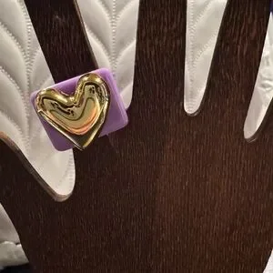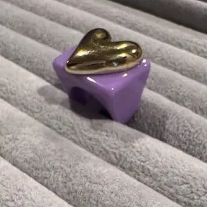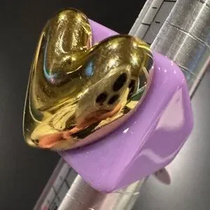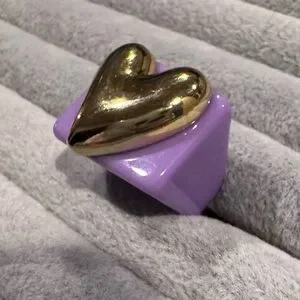 Bold, playful, and eye-catching! This chunky resin ring features a purple trapezoid band topped with a glossy gold-tone puffy heart. Perfect for adding a fun pop of color to any outfit.