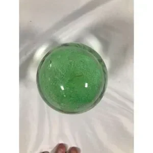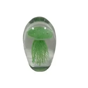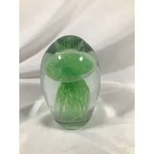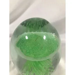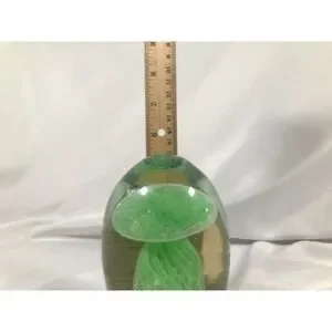 This Glow In The Dark Jellyfish Paperweight is a stunning piece of art glass, measuring 5.5 inches and weighing 3.2 pounds. The swirl pattern and green color give it a unique and decorative look, perfect for lovers of jellyfish and glass art. Hand-blown and featuring a luminous quality, this paperweight adds a touch of enchantment to any space.