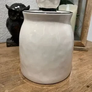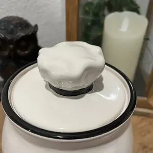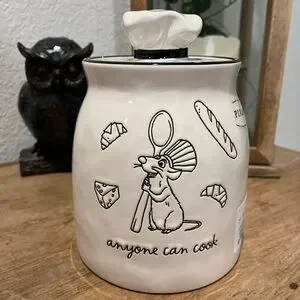 Charming Rae Dunn cookie jar. Features Ratatouille’s cooking mouse Remy design. Perfect for kitchen storage.