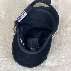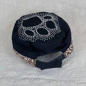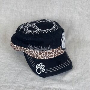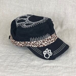 Keywords: military cap, paw print, rhinestone embellishment, leopard print trim, distressed brim, adjustable strap, casual wear, fashionable, designer inspired, animal print, studded, statement hat, dog lover
