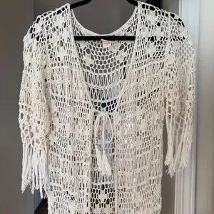 The design has a diamond stitch and elbow length sleeves trimmed with tassels. Complete with a tassel, tie-front closure.