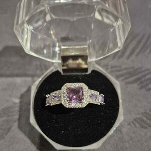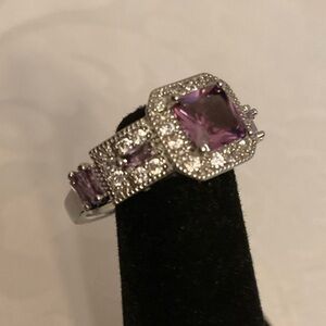 Pinkish Purple lab created pink sapphire Center stone surrounded by clear crystals