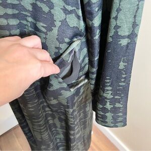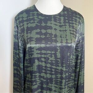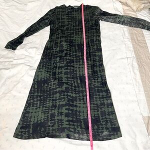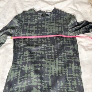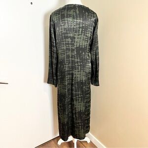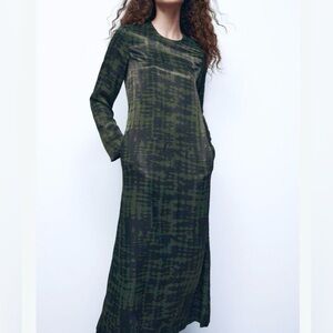 Zara Printed Satin‑Feel Viscose Midi Dress Olive Black Long Sleeve Pockets, Med.