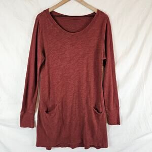Adorable soft long-sleeved comfy oversized burgundy Rust red dress from Peruvian Connection! Extra wide crew neck, slit pockets on front hips, knee length, extra long cuffs on long sleeves. Super cute boho bohemian hippy casual dress for the farmer's market or lounging on the couch! Good base for a lagenlook outfit, too!
