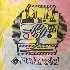 Polaroid graphic on the front with bright tie dye all over.