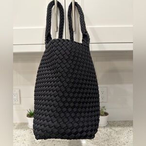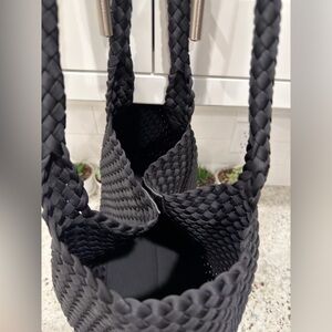 Chic and versatile BCBGMAXAZRIA woven tote bag in classic black. Features a soft, braided nylon exterior with sturdy woven handles and a spacious interior—perfect for everyday use, work, travel, or beach days. Minimalist and timeless design that goes with everything.