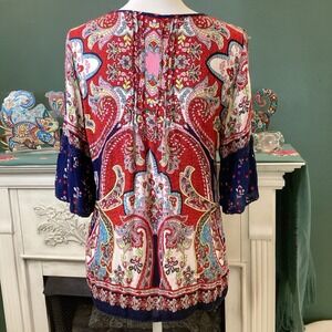 The Bila Y2K Paisley Print Blouse is a stylish and trendy top for women, featuring a unique paisley pattern in vibrant multicolor. This blouse has a cold shoulder design with a bell sleeve, giving it a contemporary and chic look. The 3/4 sleeve length adds a touch of elegance, making it a versatile piece that can be dressed up or down for various occasions. Perfect for a regular fit in size small, this blouse by Bila is a must-have for any fashion-forward woman's wardrobe.