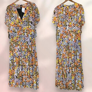 🌺FEATURE : Pulls on / Midweight, non-stretch / Regular fit / midi length / V-neck / short puffed sleeves / all-over floral print / ties at the sleeves / tiered skirt