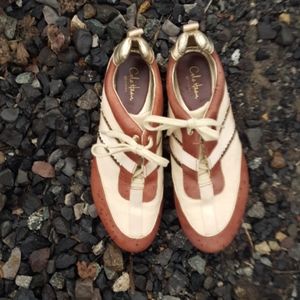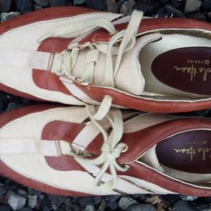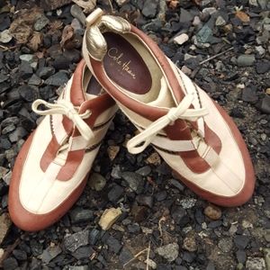 Stylish Cole Haan sneakers. Cream and brown design. Comfortable fit. Perfect for casual wear.