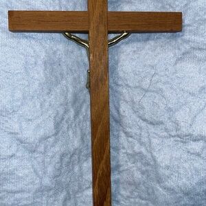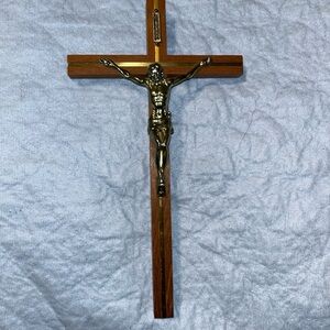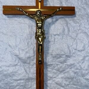 Preowned Vintage Wooden and Brass Crucifix with INRI Plaque. Measures approximately 10 1/4 inches tall by 5 1/2 inches wide. This is a vintage crucifix featuring a wooden cross with a brass figure of Jesus and an INRI plaque at the top. The craftsmanship suggests it was made in the mid-20th century, with attention to detail in the metalwork. The Vintage Wooden and Brass Crucifix with INRI Plaque stands at 10 1/4 inches tall, making it a substantial and meaningful piece of religious decor. Crafted from a combination of wood and brass, this crucifix exudes a sense of tradition and craftsmanship. Perfect for Christians looking to add a touch of spirituality to their home or place of worship, this crucifix is a timeless collectible that embodies faith and reverence. The back of the cross has a light spot. See photos. Selling from smoke free home. Thank you for looking. 2/2/26 Box #