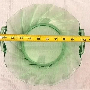 The Vintage Heisey Twist Green Moongleam Handled Plate is a unique and antique piece of glassware from 1935. This 12" oval candy dish features a twist pattern with a glossy green finish, making it a stylish addition to any collection. The Heisey brand adds value and authenticity to this original piece, which showcases American craftsmanship with its impressed backstamp and vintage appeal. Perfect for collectors of American glassware or those looking for a decorative and functional item for their home.