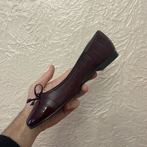 Elevate your wardrobe with these Tory Burch Cap Toe Ballet Flats in rich croc-embossed leather. Designed with a glossy leather toe, delicate bow accent, and signature gold-tone logo charm for a refined, timeless look.