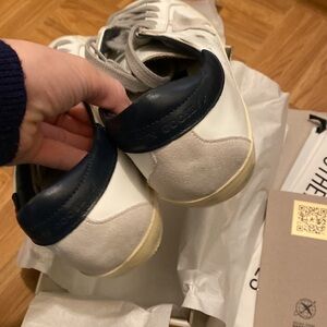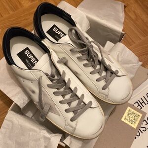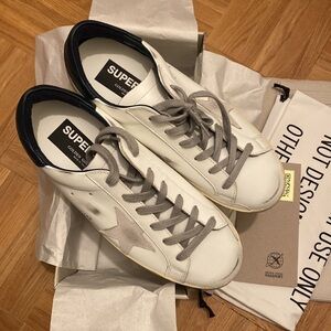 GOLDEN GOOSE WHITE SUPER STAR WITH STAR AND DARK NAVY HELLS . SIZE 39. NEW