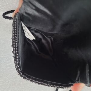 Tiny sequined and beaded black evening bag by Mollie Gladstone. Very small and will not fit a phone, only smallmotems such as a lipstick and a couple cards, but very cute and stylish.