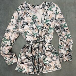 Victoria’s Secret satin robe in a gorgeous botanical/floral print with contrast piping.