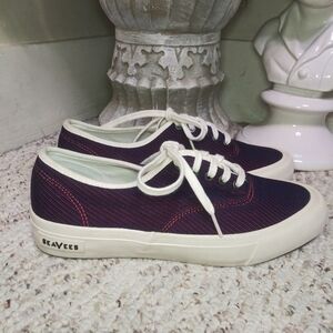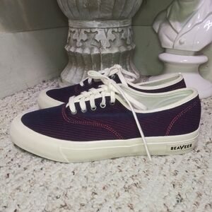 Like new, classic lace-up sneakers in a textured red and navy striped fabric with well padded leather insole, from SeaVees x Derek Lam 10 Crosby collaboration. No size marking that I could find, but the removable leather insoles measure 9 7/8 inches. This is a women's size 8 1/2 by SeaVees size chart. Original price tag was $140.00, always accepting reasonable offers. Please see all photos.
