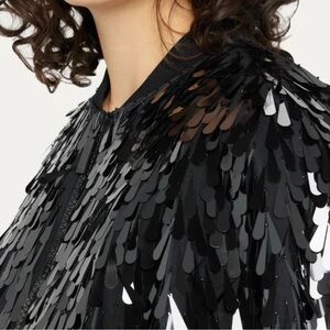 • DESIGN DETAILS: SEQUINS WITH BEAD EMBELLISHMENT; LANTERN SLEEVE WITH RIB CUFF; RIB COLLAR, FULLY LINED