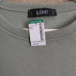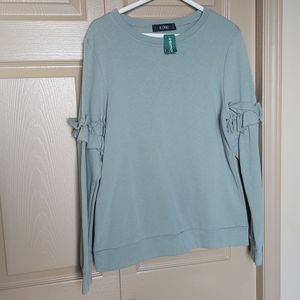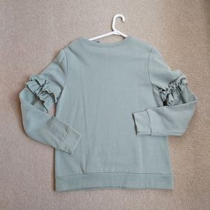 Icōne sage green, cotton, crew neck casual top with ruffle detail long sleeves in size L.