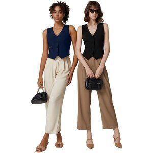 The Women's V Neck Vest Top features a chic sleeveless design with button-down detailing, accentuated by elegant stitching on both front and back, enhancing your silhouette for a fashionable look.