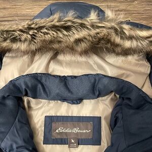 This Eddie Bauer long down puffer coat is in like-new condition and appears barely worn. Features warm yet lightweight down insulation, a flattering longline silhouette, and a detachable faux fur hood for versatile styling. Perfect for winter weather while staying sleek and comfortable. Clean, well-kept, and ready to wear.