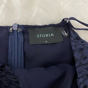 This beautiful lace dress by Storia is fully lined, and is detailed with eyelash trim. It has a concealed zipper at the back and adjustable spaghetti straps. Size medium, in excellent condition.