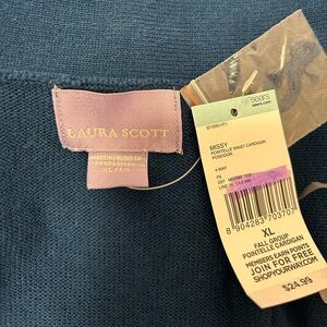 NWT Laura Scott open front cardigan in darl teal/blue, with eyelet lace accent at waist. Size XL