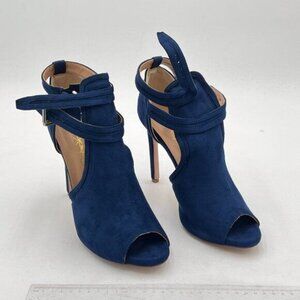 XYD Blue Women Peep Toe Ankle Bootie High Heels Buckled Double Straps Cutout
