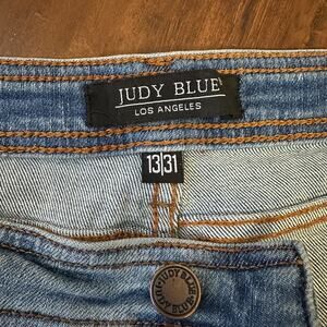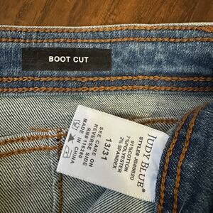 The product is a pair of Judy Blue bootcut jeans in a women's size 31. Made from denim fabric with a high rise and pleated accents, these jeans feature a comfortable and stretchy design with a 5-pocket design. The solid blue color and grunge theme make them a versatile option for all seasons. The brand Judy Blue offers a regular fit and is known for its quality and style. Perfect for those who love a hippie, grunge, or hip hop aesthetic, these jeans are machine washable and made from a blend of polyester, spandex, and cotton.