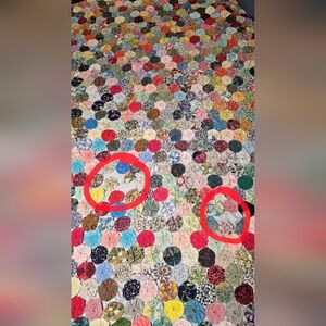 IT DOES HAVE SPOTS WHERE THE FLOWERS HAVE DETACHED AND THERE IS SPACE IN BETWEEN. ALSO SOME FLOWERS HAVE UNSTICHED OPENING UP. The top corners go at an angle giving the quilt more character. See pictures