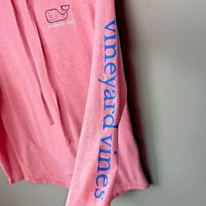 Great gently used condition. No noted flaws. The Vineyard Vines Edgartown Long Sleeve Hooded T-shirt in Women's XS Pink is a stylish and comfortable pullover top. Made of cotton knit fabric, this solid pink shirt features a whale character logo and a hood for added convenience. With a casual sleeve and a regular fit, this basic t-shirt is perfect for casual occasions during the summer, fall, and spring seasons. Easy to care for with its machine washable property, this preppy-themed shirt from Vineyard Vines is a versatile addition to any woman's wardrobe.