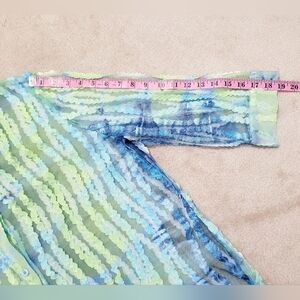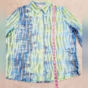 Erin London XL sheer mesh blouse in green/blue stripe with textured wavy ribbons. Long sleeves, button-front, collared. Excellent condition.
