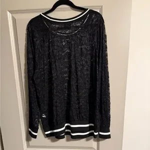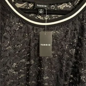 Chic black lace top featuring elegant white trim. Ideal for stylish occasions. New with tags. Torrid size 2