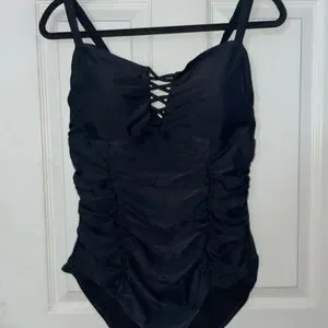 Flattering and fashion-forward, this Torrid one-piece thick fabric swimsuit features a classic black design with ruching throughout to enhance and smooth your silhouette. This is in in excellent condition. It was $69 when I bought. The crisscross neckline adds eye-catching detail while offering a stylish, supportive fit. Comfortable, confidence-boosting, and timeless, this swimsuit is perfect for pool days, beach trips, or resort wear. A must-have staple that blends style and function effortlessly.