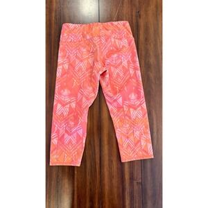 Elevate your workout wardrobe with these vibrant Alo Yoga crop leggings. A striking geometric print in shades of coral, peach, and white creates a visually dynamic look that's sure to turn heads. The high-performance fabric offers a comfortable and supportive fit, allowing you to move freely during any activity. These leggings are perfect for yoga, running, or any other fitness activity. They're also stylish enough to wear for casual outings or errands.