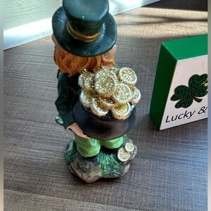 Celebrate St. Patrick's Day with this charming leprechaun figurine and sign set. Featuring vibrant green accents, it's perfect for adding a festive touch to your home decor.
