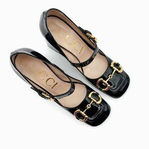A Mary Jane pump with vintage accents such as a square shaped toe and sculpted block heel. A code from the archives, the Horsebit detail connects the style to the House's equestrian roots.