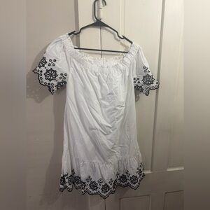 Vineyard Vines eyelet off-the-shoulder dress in white with black embroidery.