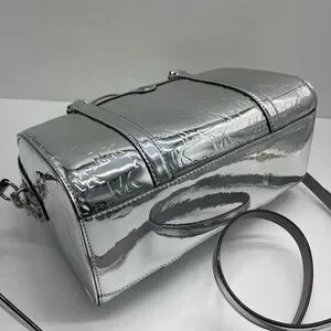 MICHAEL KORS Jet Set Medm Patent Logo Debossed Duffel Crossbody Bag Silver NWT