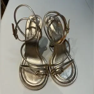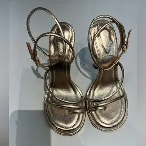 Chic metallic sandals with elegant straps. Features a stylish heel and secure ankle strap.
