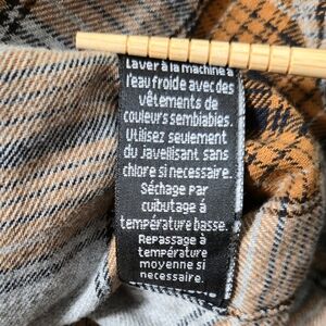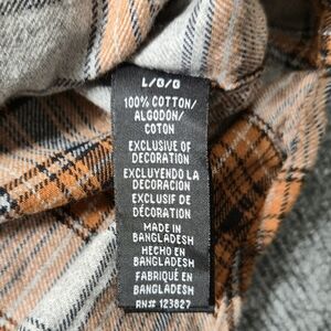 This is a classic, cozy long-sleeve flannel shirt by Raw Yarn Industries (Brooklyn NYC LA), size Men's Large (L). It is made from soft, breathable 100% Cotton and features a warm plaid pattern in shades of Orange, Rust, Gray, and Black. The design includes a full button-down front and dual chest pockets, one with a unique zipper detail. Perfect for casual wear, layering, or adding a rugged touch to your wardrobe. That is an excellent use condition.