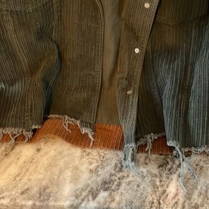 Stylish corduroy jacket with a multicolor design. Features brown, cream, and green panels. Frayed hem for a trendy look. Button-up front with chest pockets.