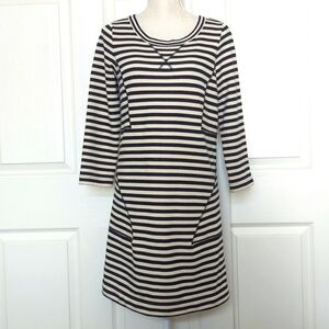 Marc by Marc Jacobs Ben Dress. Black and cream cotton Terry stripe dress. 3/4 length sleeve. Contrast stitching on sides. Embroidery on back shoulder. 63% Cotton / 37% Polyester
