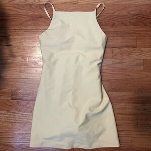 Yellow, size small! No tags, but never worn!! See website photos for fit, but the dress is a light yellow (first photo is accurate). It does have built in shorts.