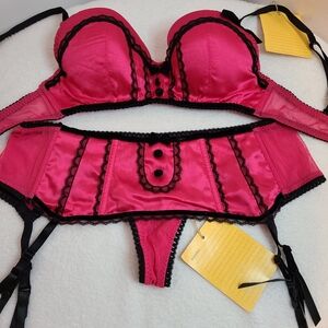 Sexy Little Things - Silky Satin tuxedo bra & garter panty set - beautiful hot pink shiny satin with black tuxedo style trim & details - Underwire push-up bra & matching skirted garter thong panty