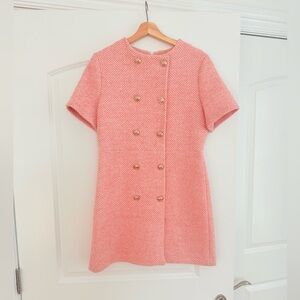 This elegant pink tweed dress features a classic double-breasted design with gold button accents. Perfect for any occasion, it combines style and sophistication.