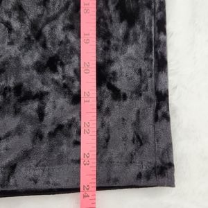 This is a beautiful black velour top. The top is super sleek feeling, and features a square neckline, and long sleeves. The hem of this top is a straight hem. This top is meant to be close-fitting.