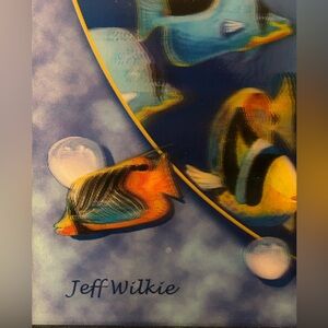 This product is a set of 2 framed 3D hologram wall art pictures by artist Jeff Wilkie under the brand Open Road. The pictures feature ocean life subjects such as turtles and fish, with vibrant colors and a modern style. Measuring 14" x 14", these ready-to-hang artworks are suitable for any room and add a unique 3D effect to the decor. Made of plastic, these framed pictures are perfect for teens, adults, and kids who appreciate art and ocean-themed decorations for their home.