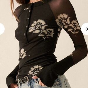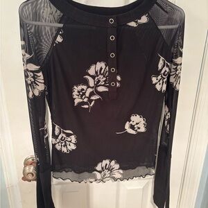 Chic black blouse with floral pattern. Sheer fabric. Long sleeves. Stylish and versatile. Lettuce hem. Fitted. A bit on the cropped side of length but not a true crop.